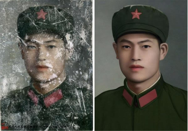 老照片修复是在照片本身的破坏程度不是很大,或者可以用移植的办法补全,保持原照片的质感。这样就可以尽量不作大的修改。只要顾客满意,对修片人来说也修得轻松。但对于特别破烂的照片,又是绒面的,带布纹或斑点的。就要用翻新的手段来处理,全面的修整照片,要不就会出现脏兮兮的感觉。为了尽量避免照片做得像平面,可以在后期处理上下功夫。比如添加杂色或移植皮肤层等等,把照片做旧。